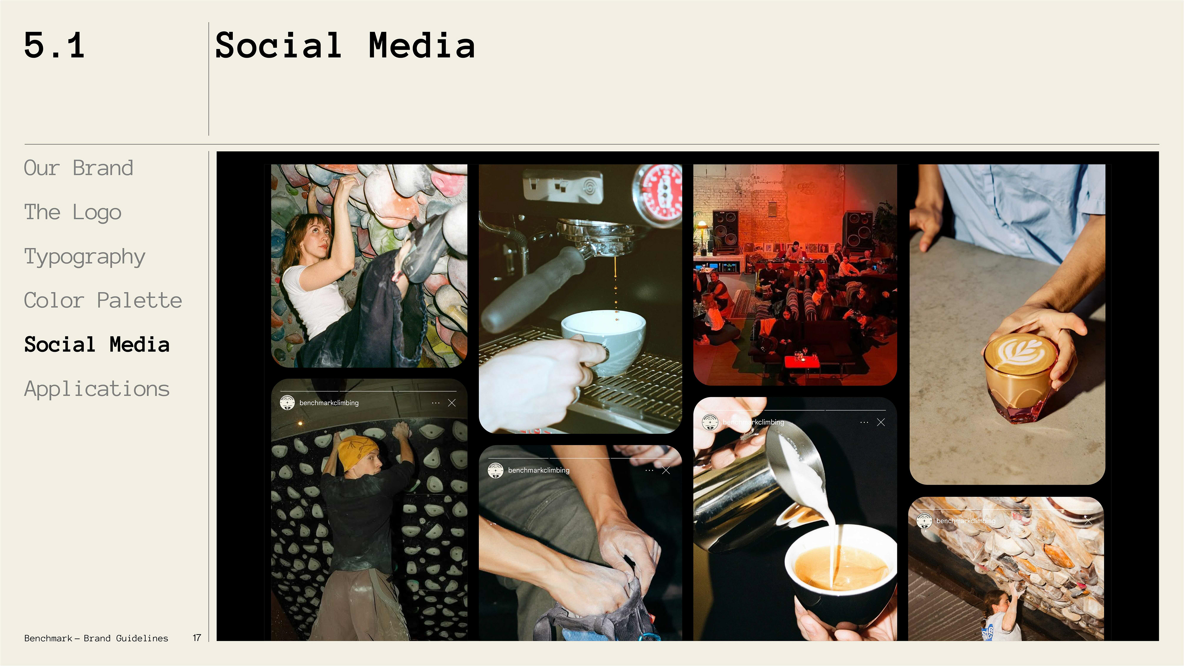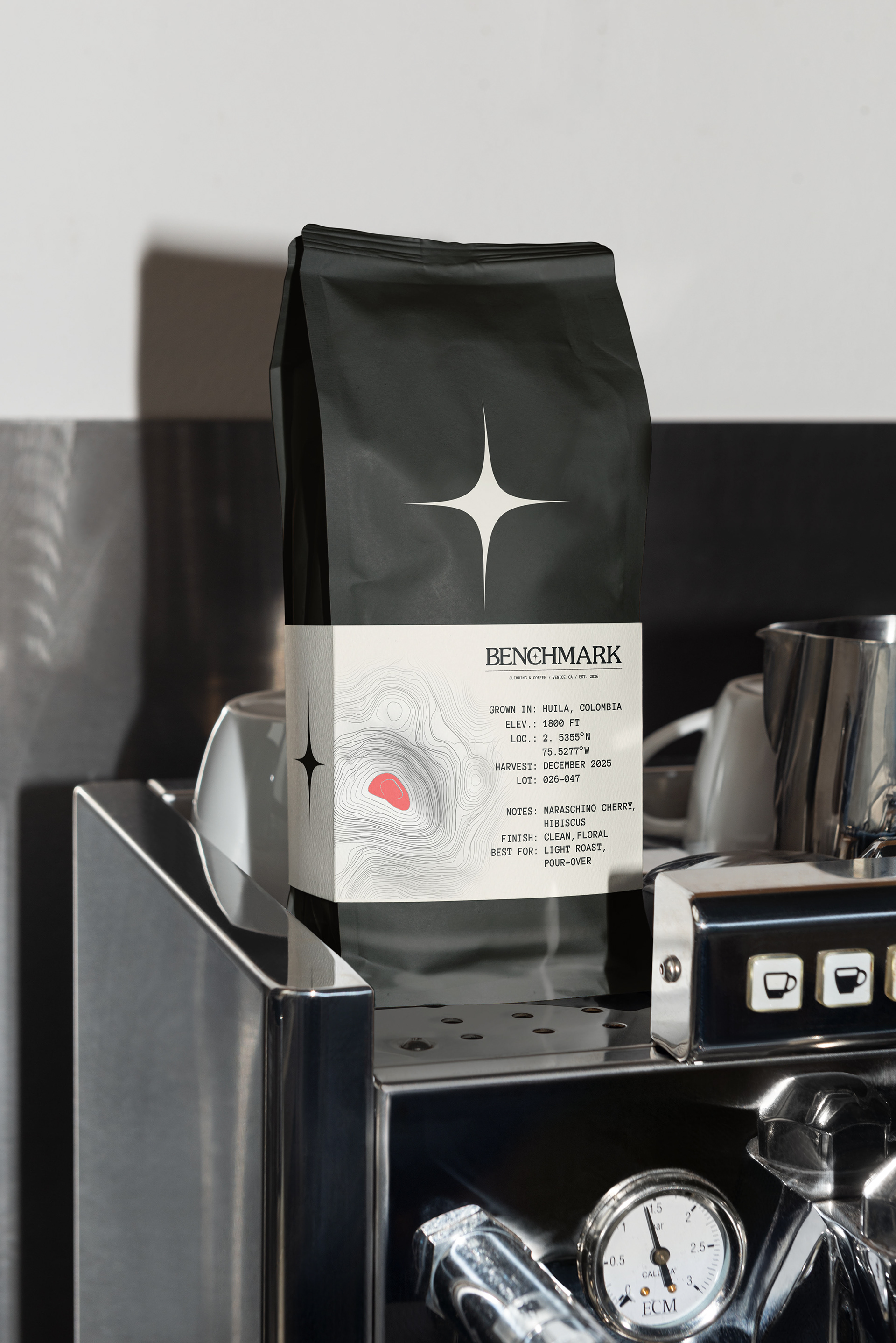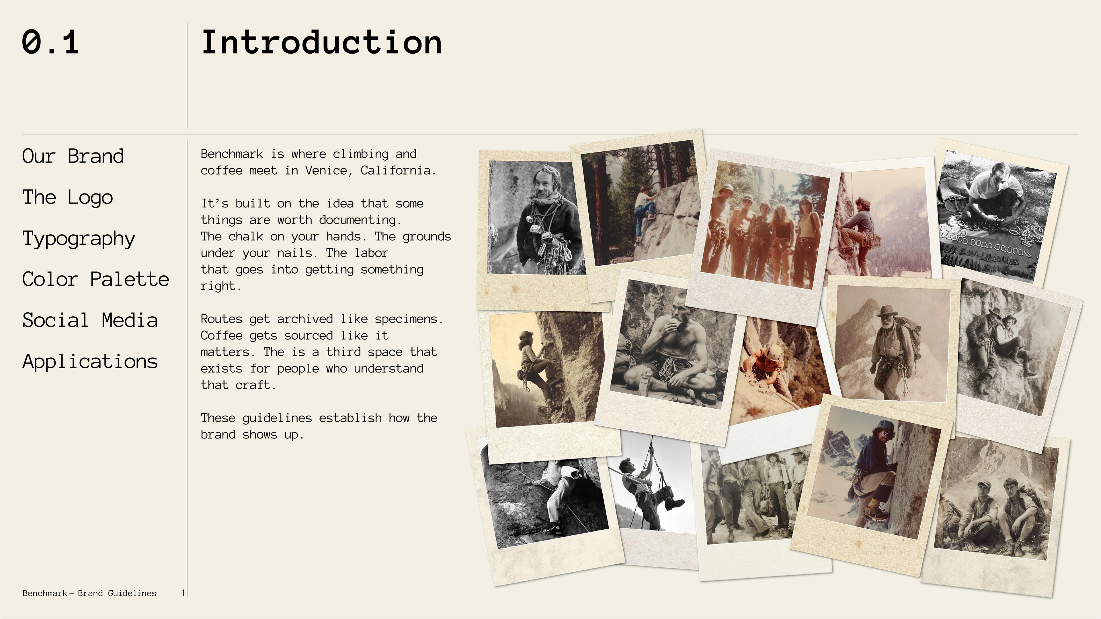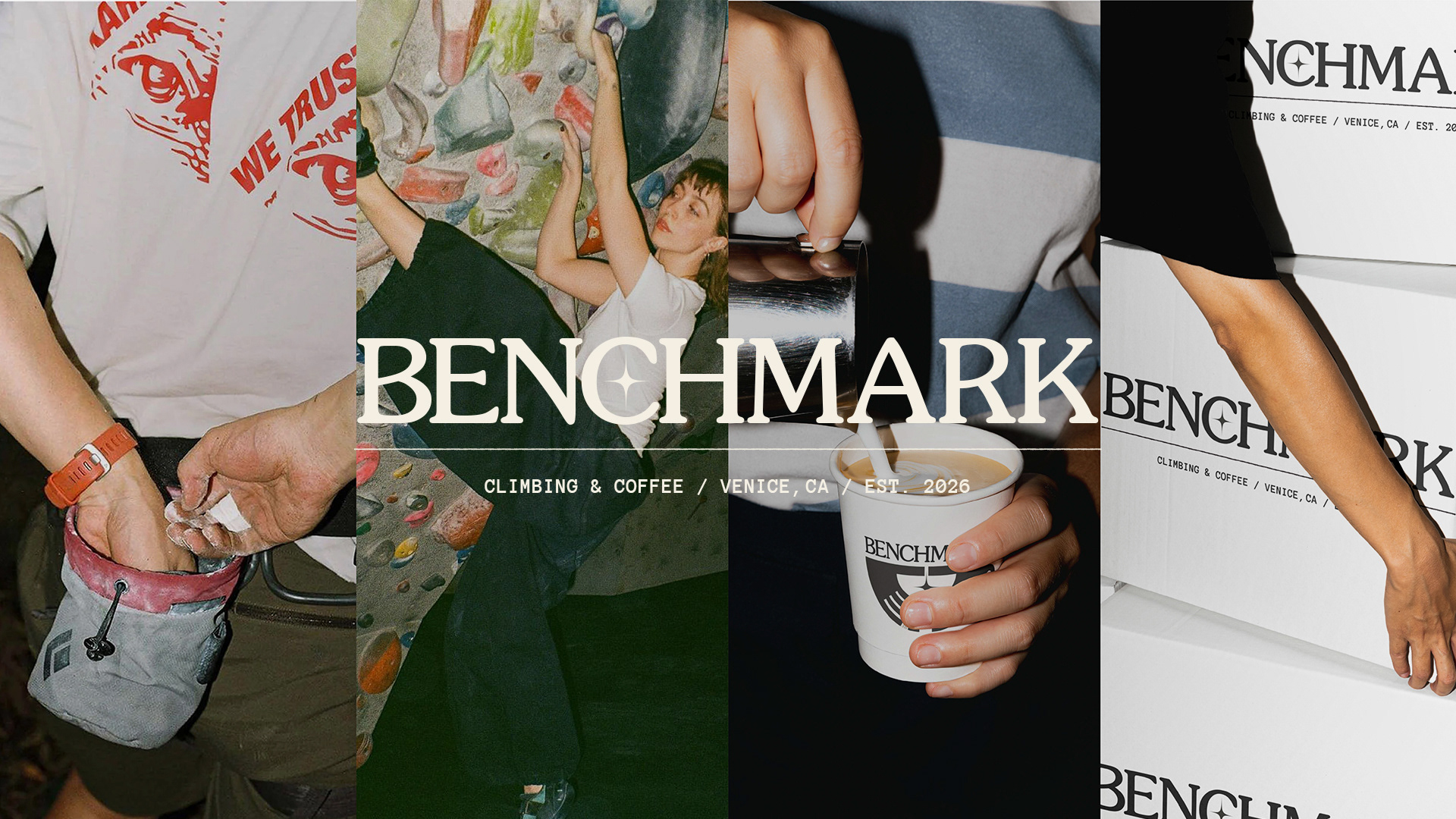 A climbing gym and specialty coffee shop brand exploring the intersection of physical craft and archival documentation. Benchmark treats routes and coffee as artifacts worth preserving, challenging the disposable, algorithmic aesthetic of modern fitness culture through deliberate design, analog textures, and institutional permanence.