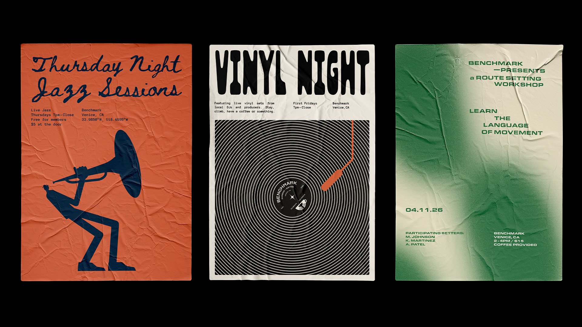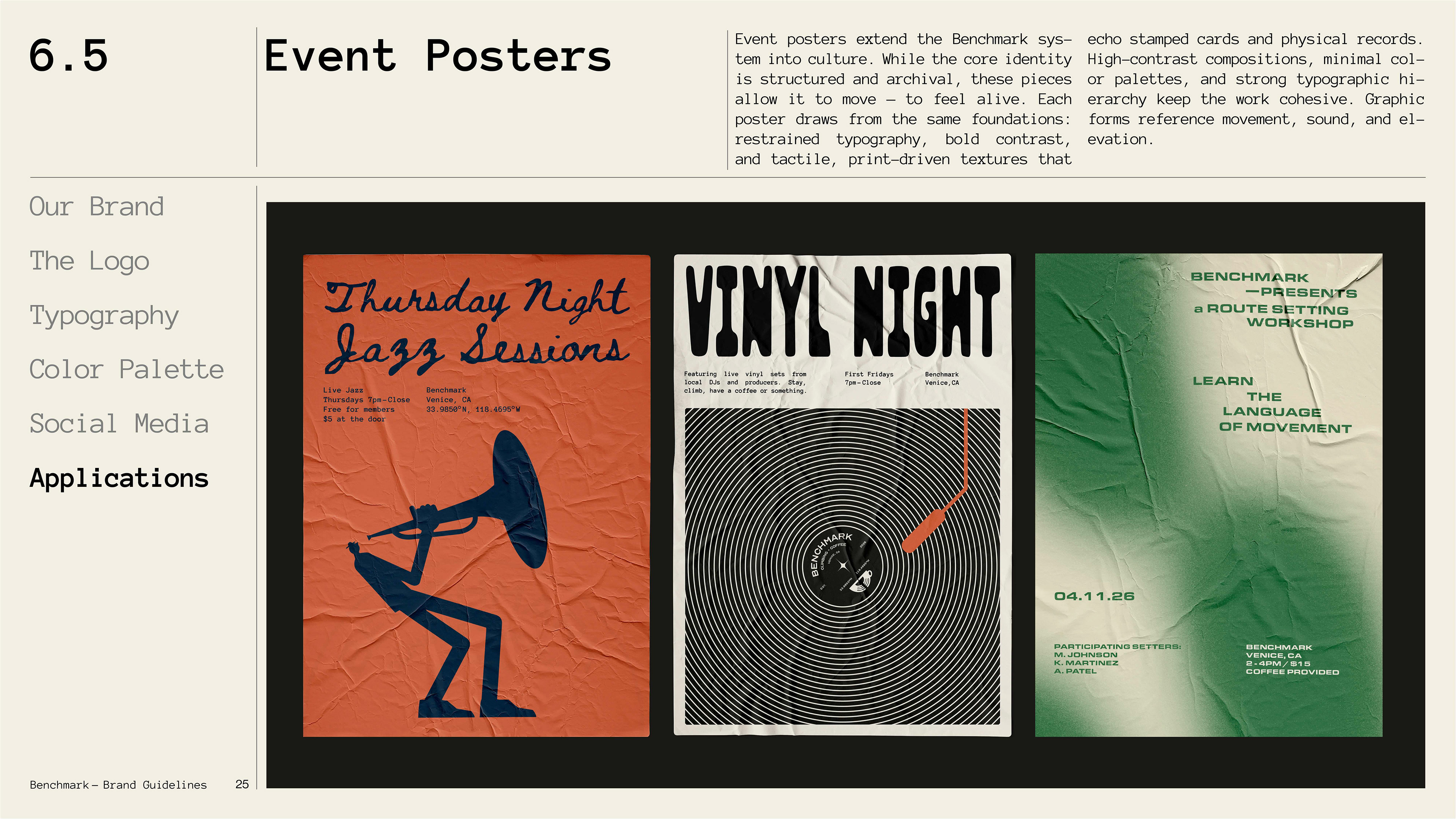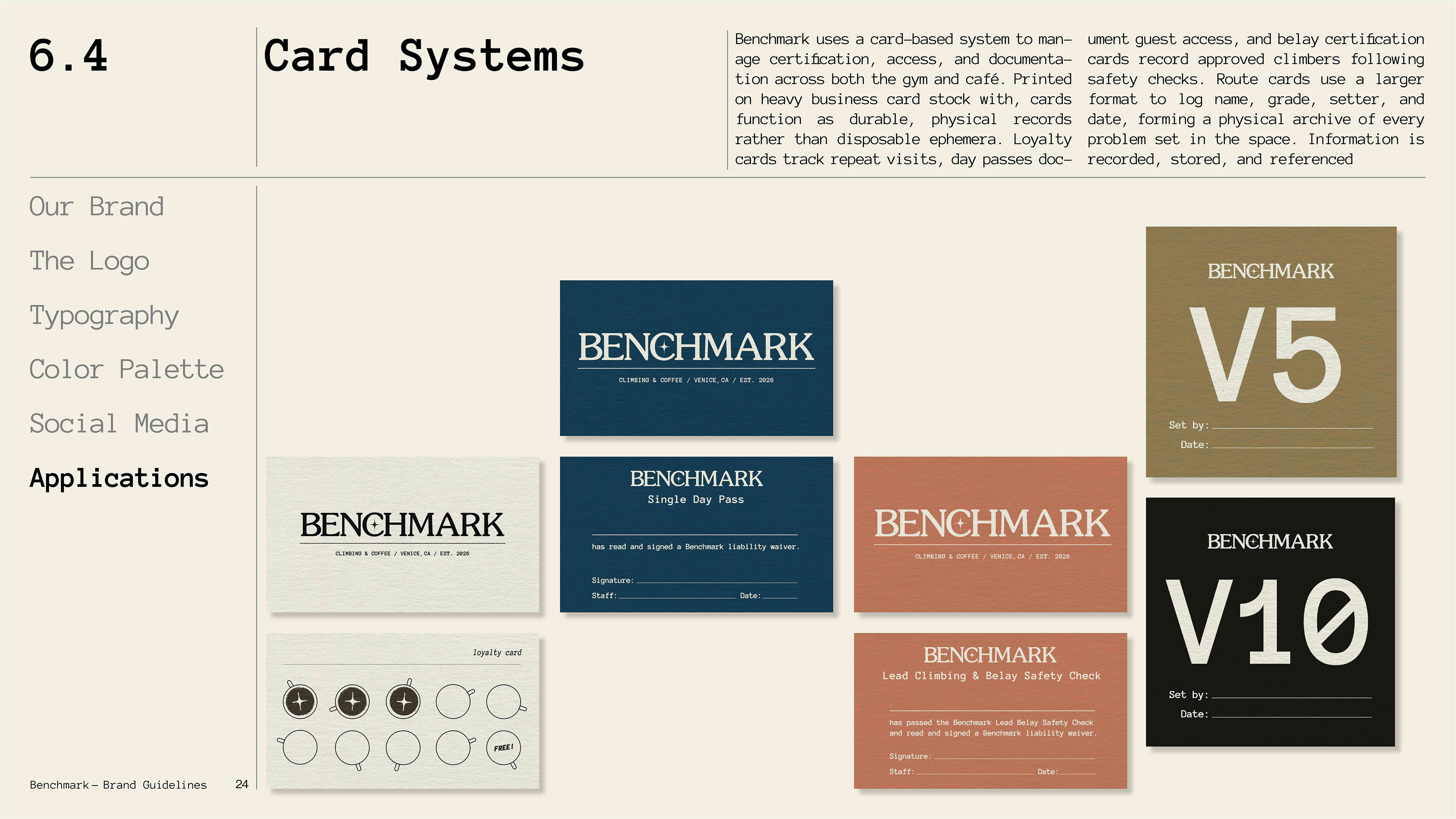 A climbing gym and specialty coffee shop brand exploring the intersection of physical craft and archival documentation. Benchmark treats routes and coffee as artifacts worth preserving, challenging the disposable, algorithmic aesthetic of modern fitness culture through deliberate design, analog textures, and institutional permanence.
