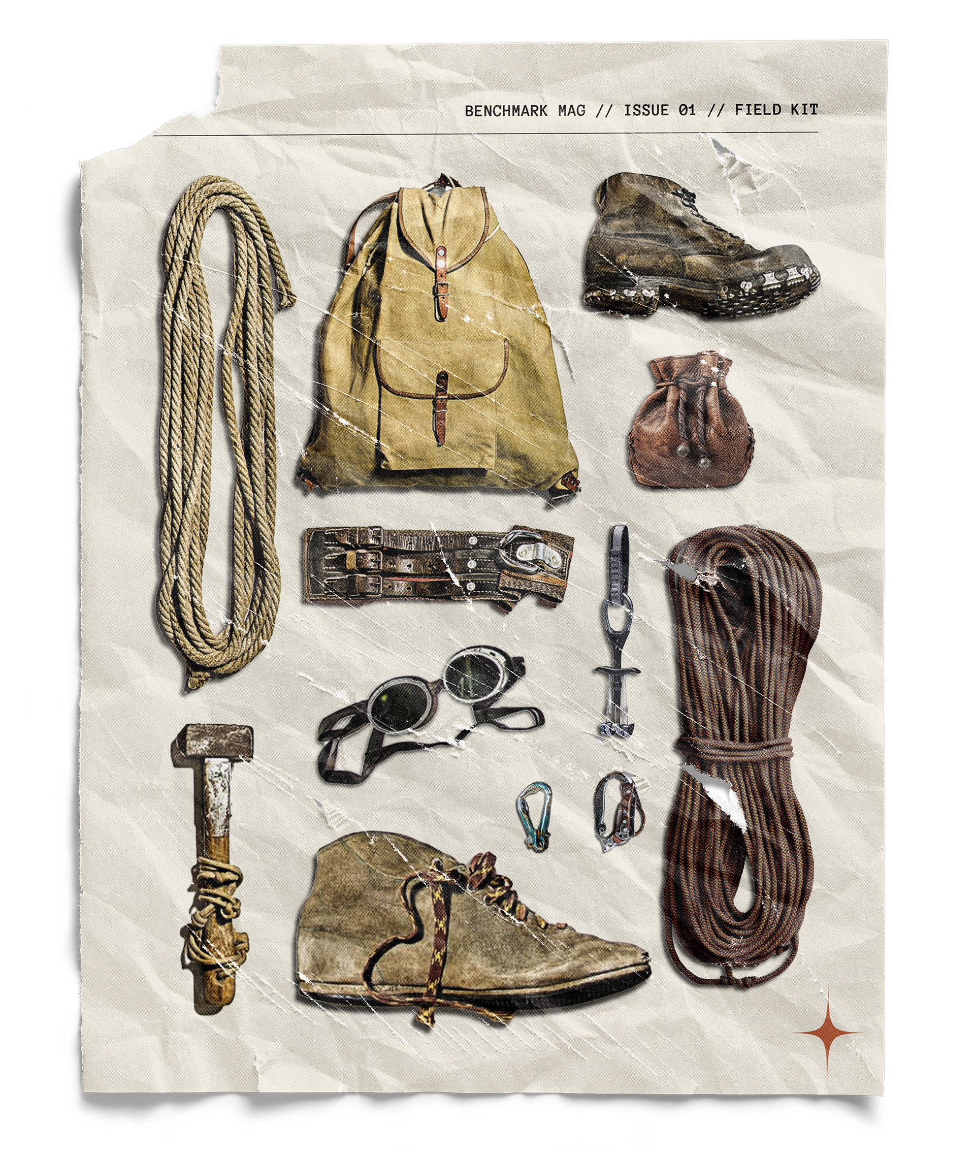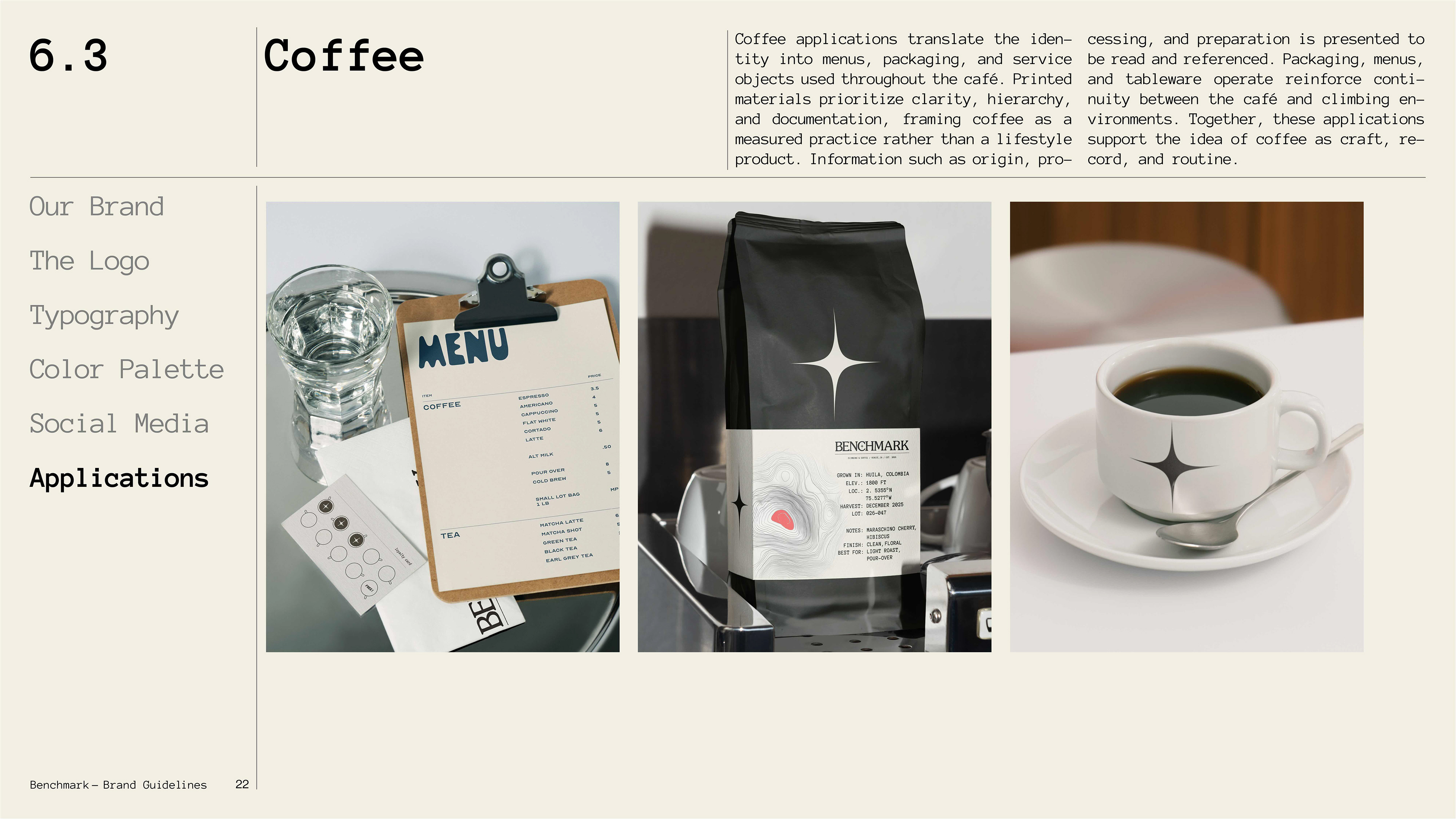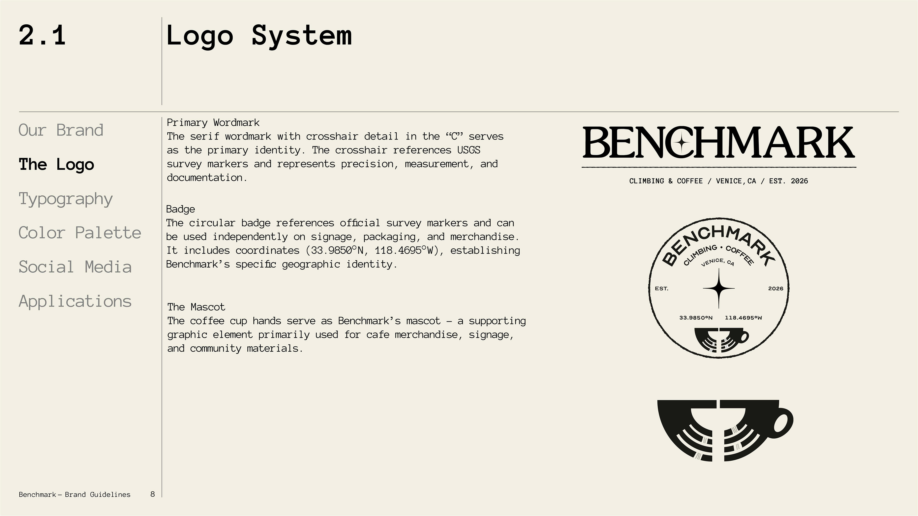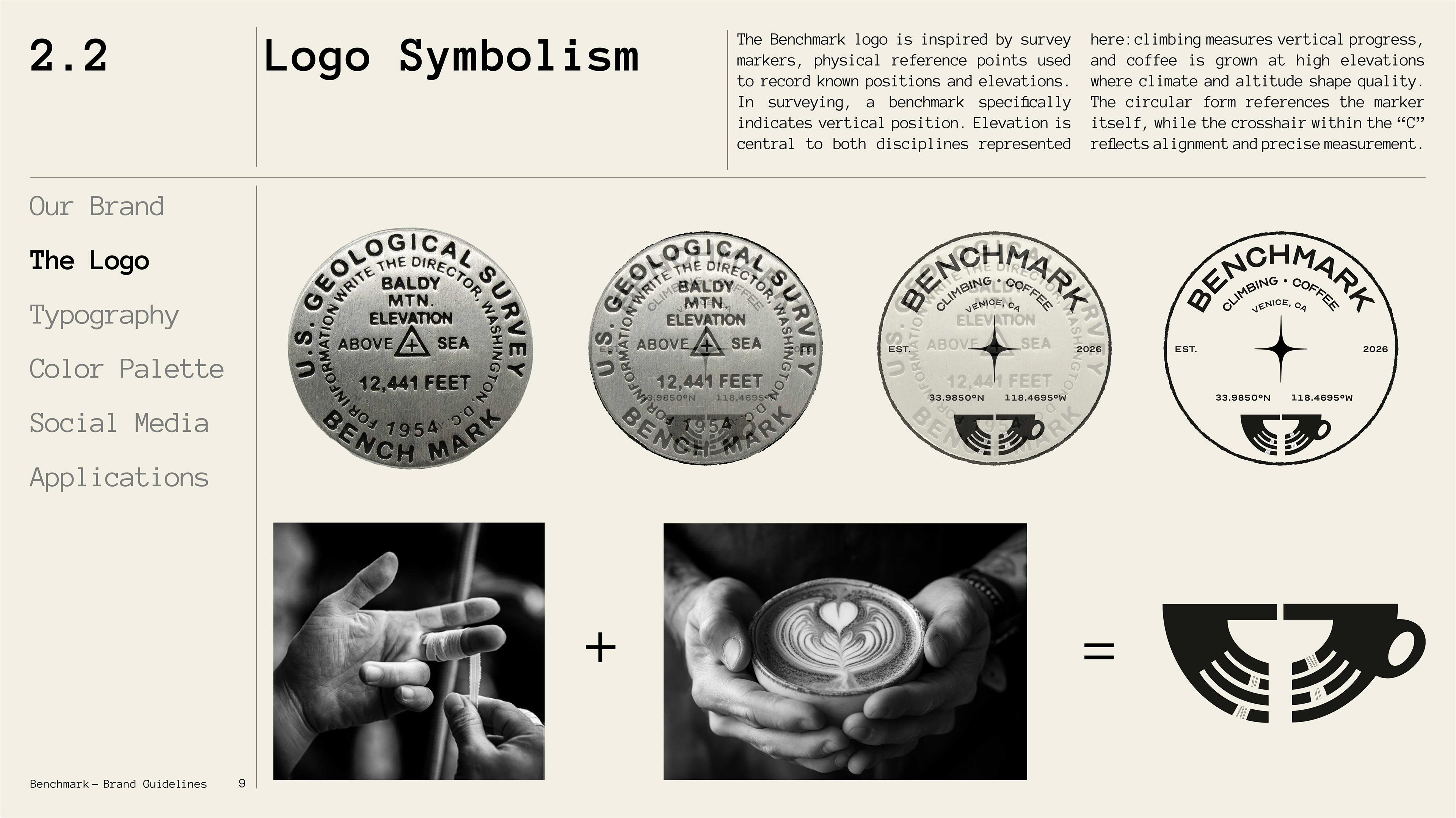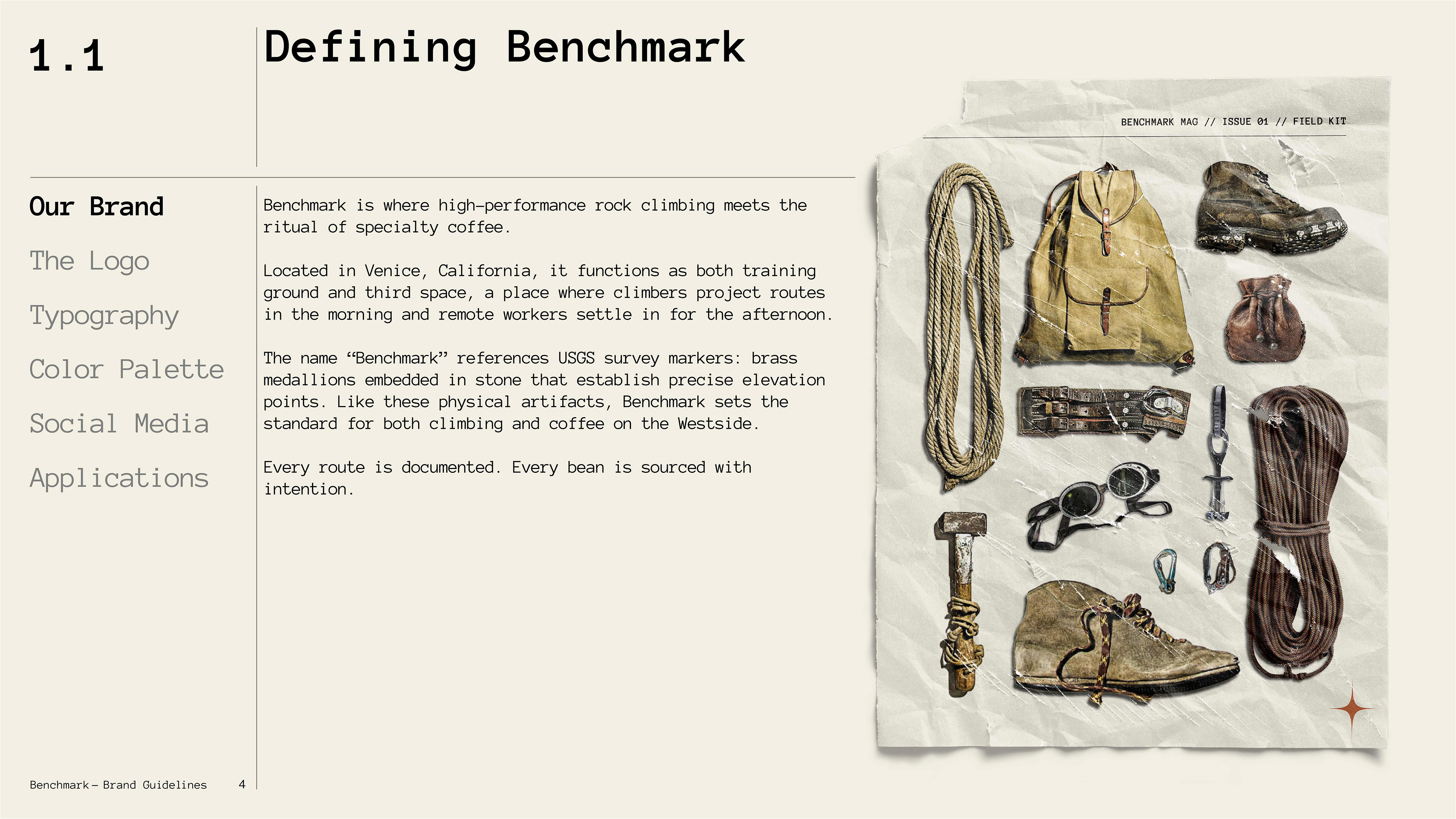 To build a complete brand from the ground up, establishing every layer of identity from conceptual positioning to execution. The project began with defining "archival archaeology" as the core philosophy: treating climbing routes and coffee origins as physical artifacts worth cataloging and preserving. This concept informed naming, logo development, typography systems, color theory, and material choices across all touchpoints. Every element references USGS survey markers, 1970s climbing heritage, and specialty coffee documentation practices, establishing Benchmark as a third space where measurement, craft, and community coexist.
